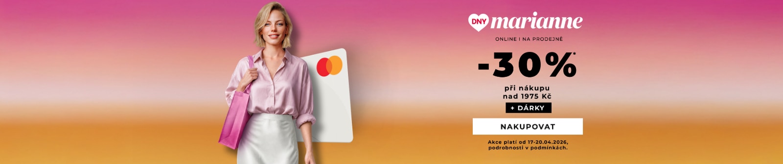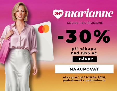 *Sleva platí od 17. 4. do 20. 4. 2026 v prodejnách Marionnaud po odevzdání kuponu Marionnaud Dny Marianne a na e-shopu marionnaud.cz po zadání promokódu, při splnění podmínky. Sleva neplatí na značky Dior, Chanel. Slevy není možné kombinovat.