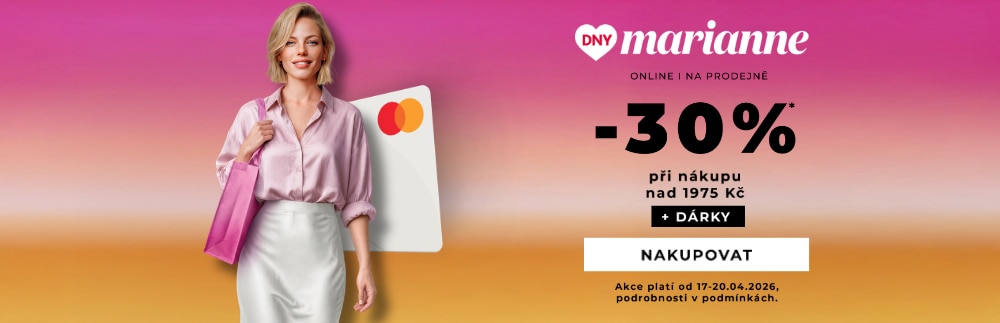 Pro získání slevy 30 % při nákupu nad 1 975 Kč zadejte promokód Dny Marianne Marionnaud. Promokódy k nákupu na e-shopu naleznete v aplikaci DNY MARIANNE www.dnymarianne.cz nebo v příloze vydání časopisů Marianne, Marianne Bydlení a Marianne Venkov a styl.