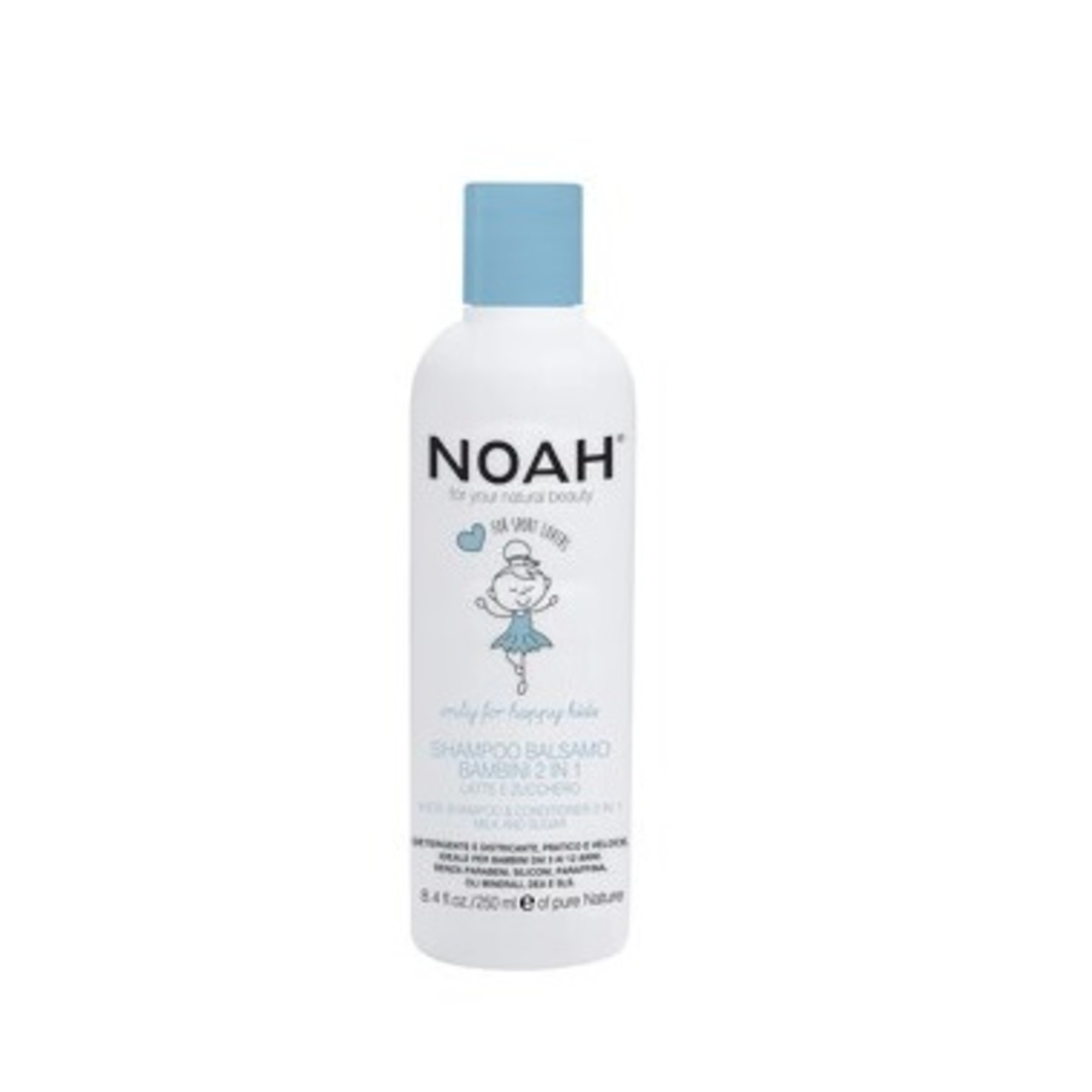 Šampon a kondicionér pro děti v jednom flakonu jemně čistí vlasy a díky zvlhčujícím přísadám má produkt také kondicionační účinek. Obsahuje zvlhčující cukr, vyživující sladké mandlové mléko a murumuru olej, které vyživují, změkčují a zabraňují krepatění.