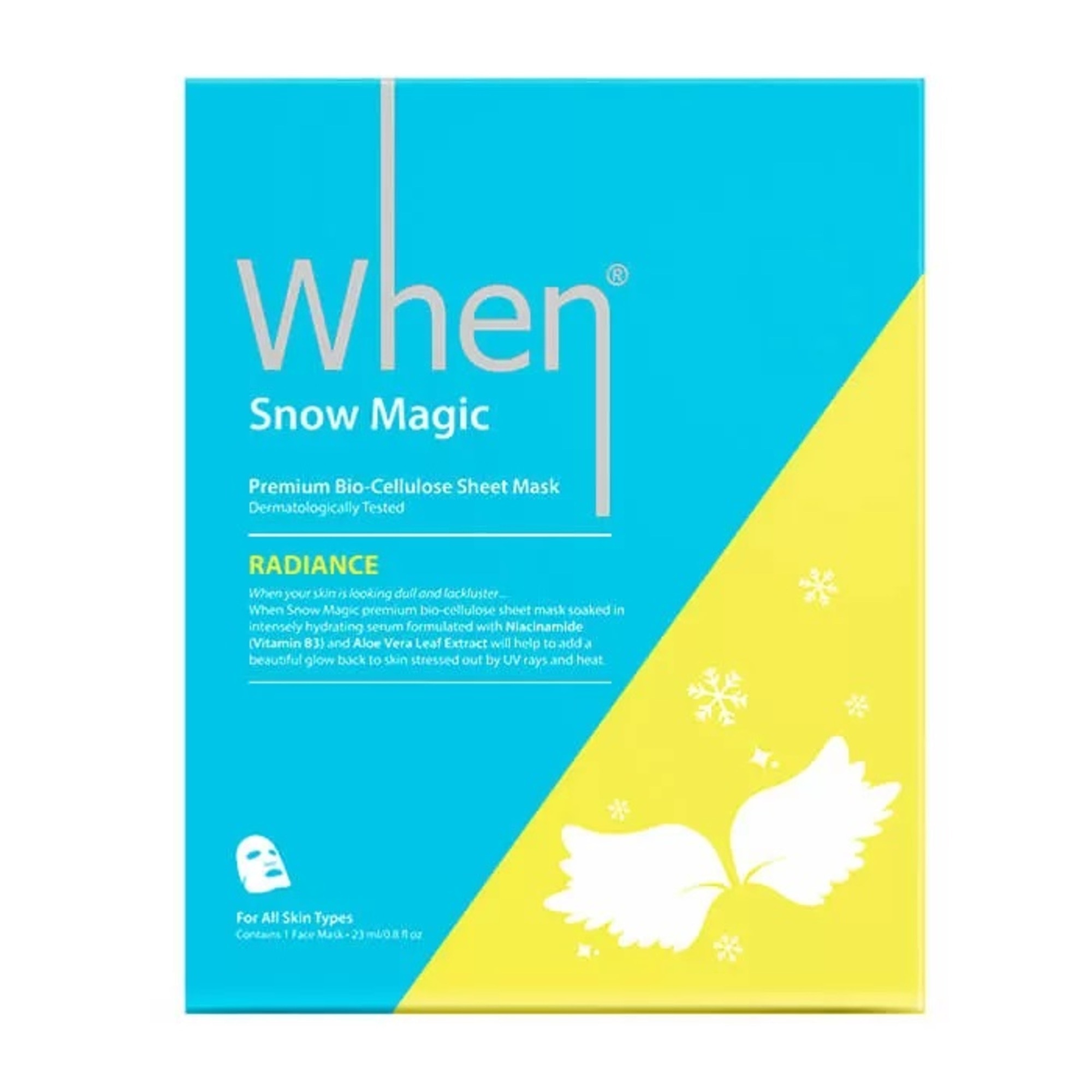 Maska Snow Magic je napuštěna biokvalitním sérem s obsahem niacinamidu (vitamin B3), který pomáhá pleti udržet vlhkost a redukuje výskyt tmavých skvrn, a výtažky z listů aloe vera, které pleť rozjasňují, zklidňují a chrání. Obsahuje také hyaluronát sodný, který pomáhá chránit a hydratovat pleť, a výtažky z ženšenu pro zdravější vzhled pleti.